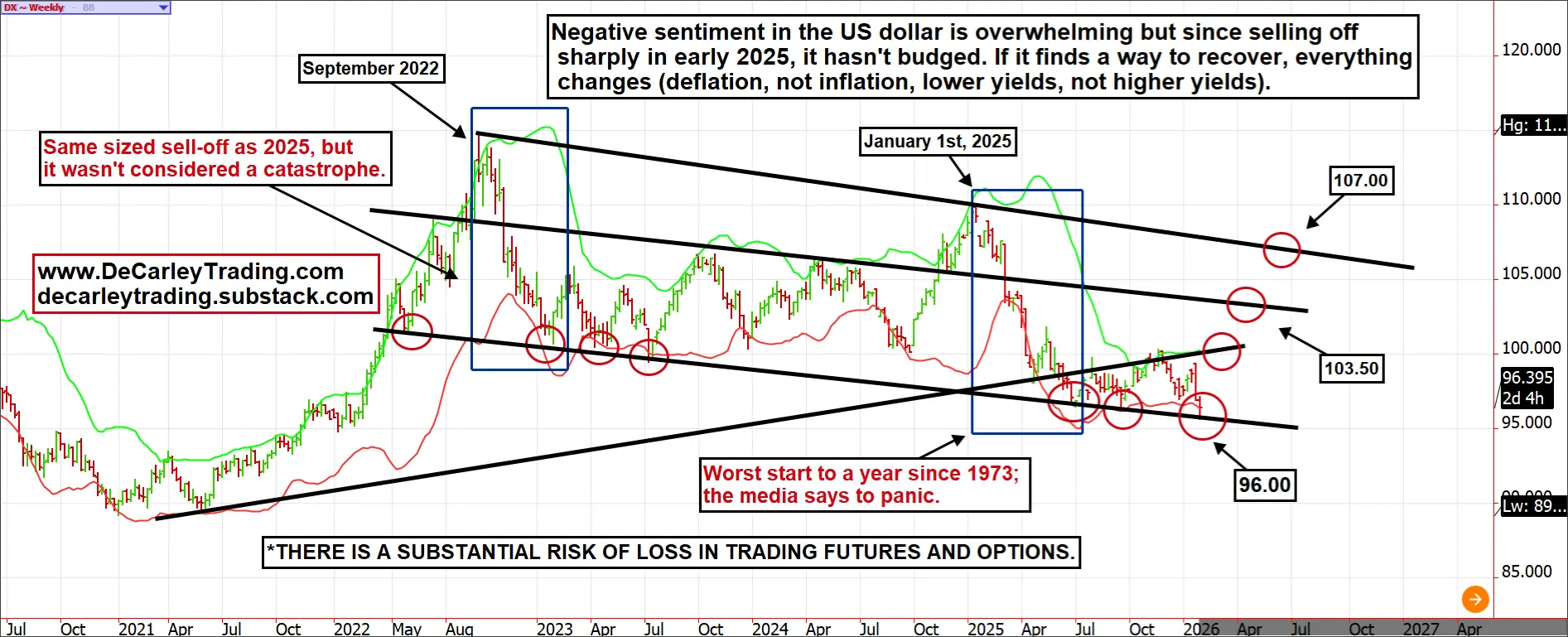 The markets reacted violently to an off-the-cuff statement made by President Trump last night, hinting at a weak-dollar policy. Yet Scott Bessent said this morning on CNBC that they are practicing a strong-dollar policy. Which is it? Fin-X is focused on the dollar breaching a multi-year uptrendline, but what about this weekly downtrendline? I don't know what happens next, but the implications either way are substantial for asset pricing. #dollar #metals #gold #silver #debasement